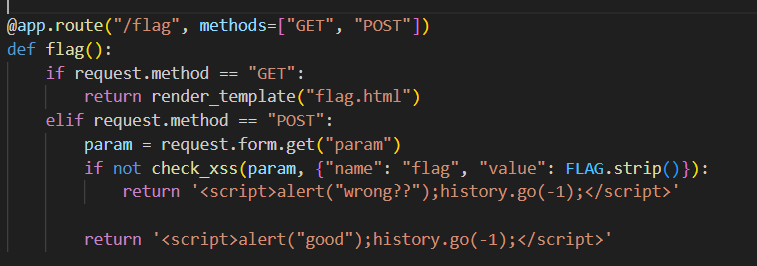 get은 'flag.html'페이지를 제공하고, post는 파라미터값과 flag를 포함하여 check_xss 함수를 호출한다.